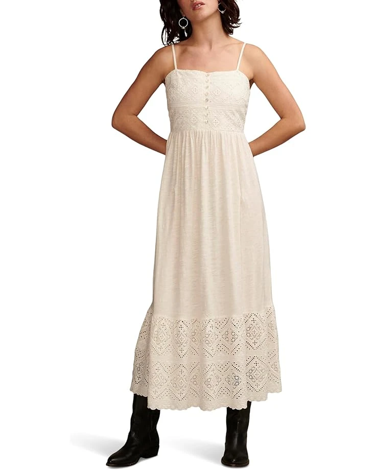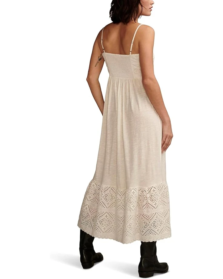 - Meet your charming yet comfortable companion for those sunny days! The Lucky Brand® Cutwork Maxi Dress boasts a smocked fabrication with a longline maxi silhouette which is enhanced by the intricate cutwork detailing. It is crafted in cotton and makes an ideal choice for the warm weather adventures.