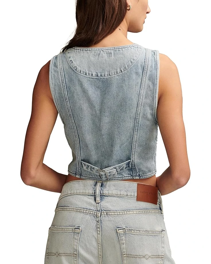 - Define your dapper look wearing the standard length Lucky Brand® Denim Vest. Made from soft-knit fabric, this wardrobe essential jacket features V-neckline, sleeveless style, button-down front closure, chest welt pockets and pointed hem for a complete ensemble.