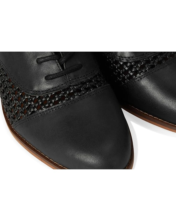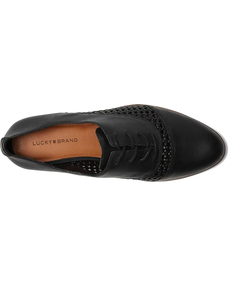 - The Lucky Brand® Elfie is a low-top oxford featuring intricate cut-out woven textures that provide breathability. With a stacked heel, the lace-up footwear features leather upper construction, polyester lining, and rubber insole.