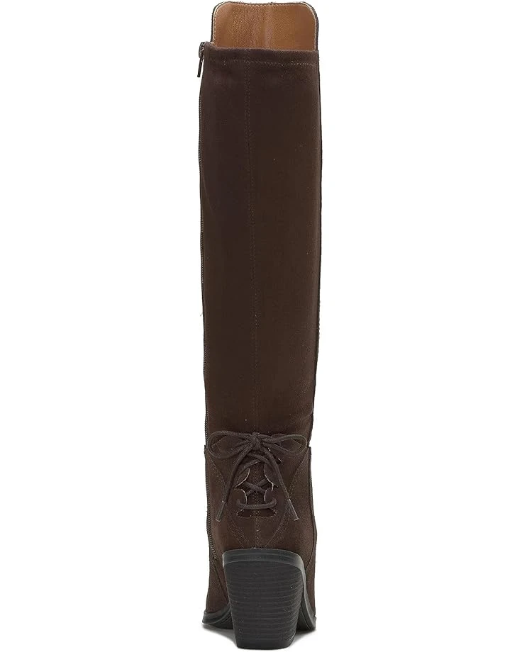 - Walk like a diva wearing the Lucky Brand® Mekinna. Featured in soft suede leather, this zip-up boot has corset-style lace-up detail at the slanted heel and a padded footbed for all-day comfort.