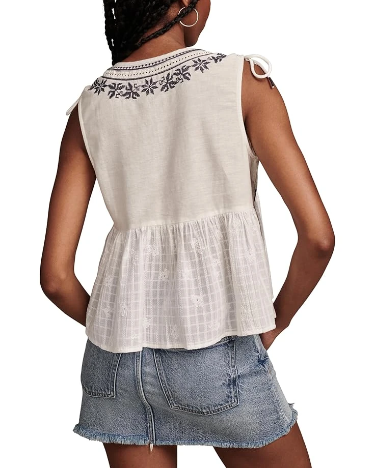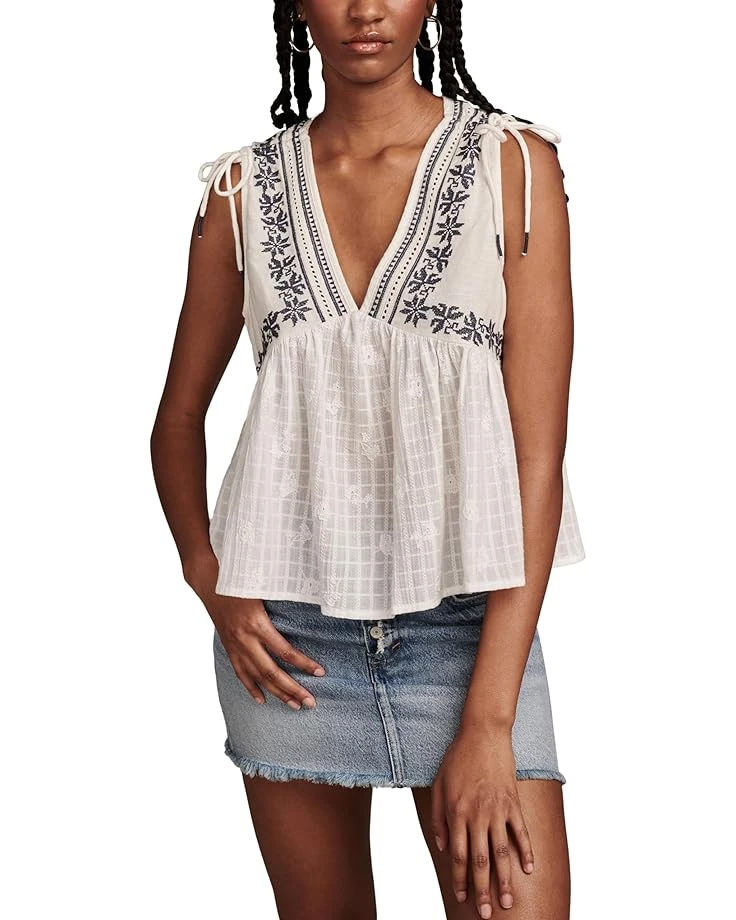 - Style fashionably wearing the Lucky Brand® Ruched Shoulder Deep V Top while going outdoors. It features deep V-neckline, pull-on style, and ruffled drop. A sleeveless design make it breathable while embroidered detailing ensures chic look.