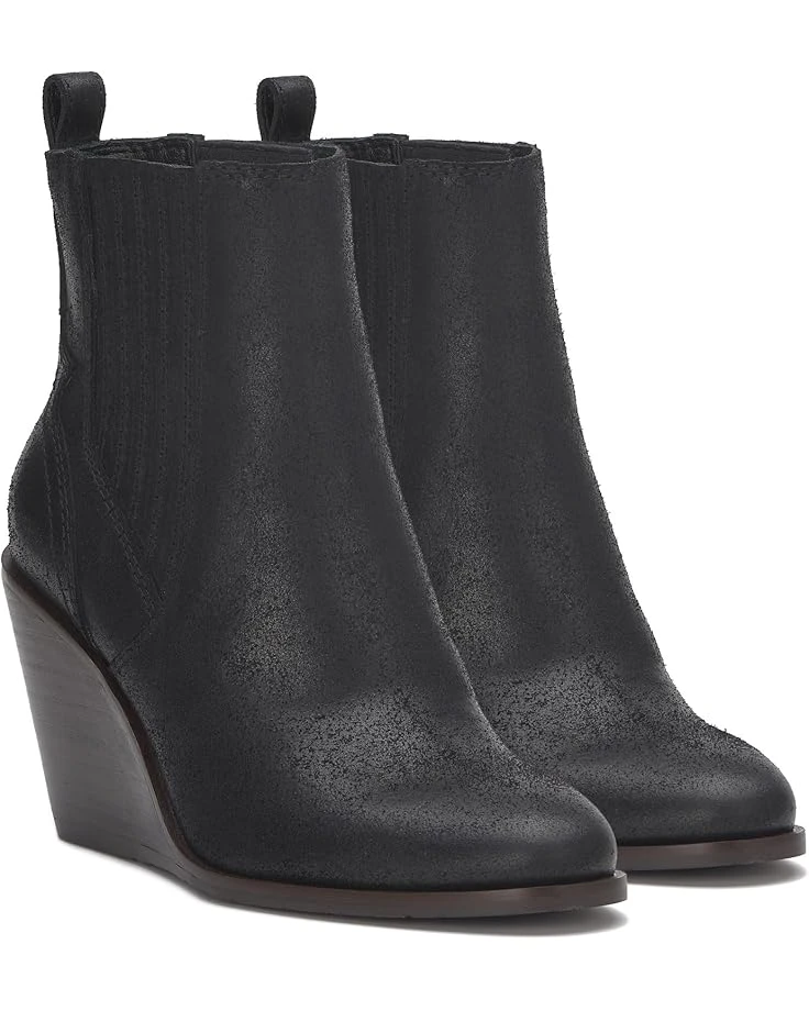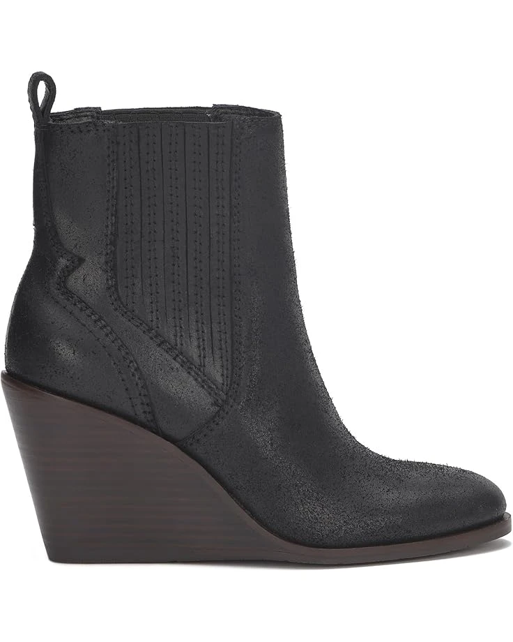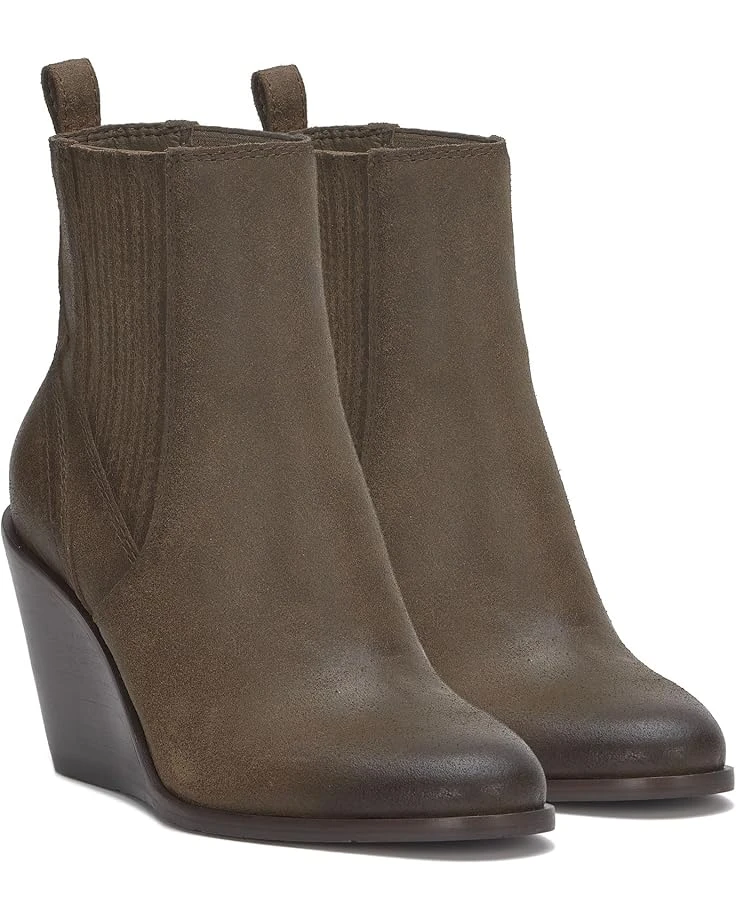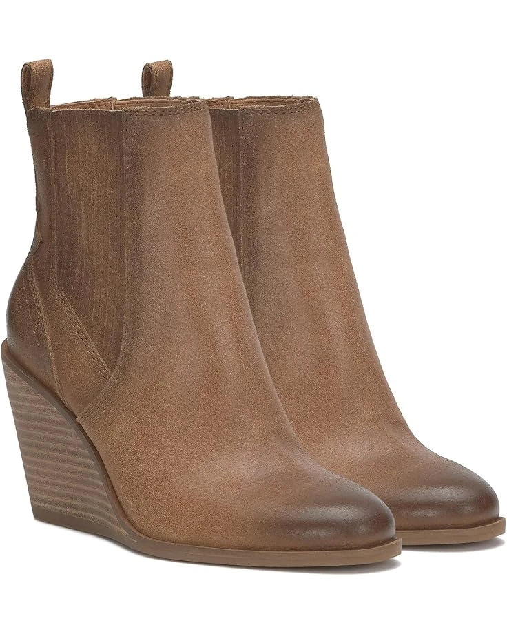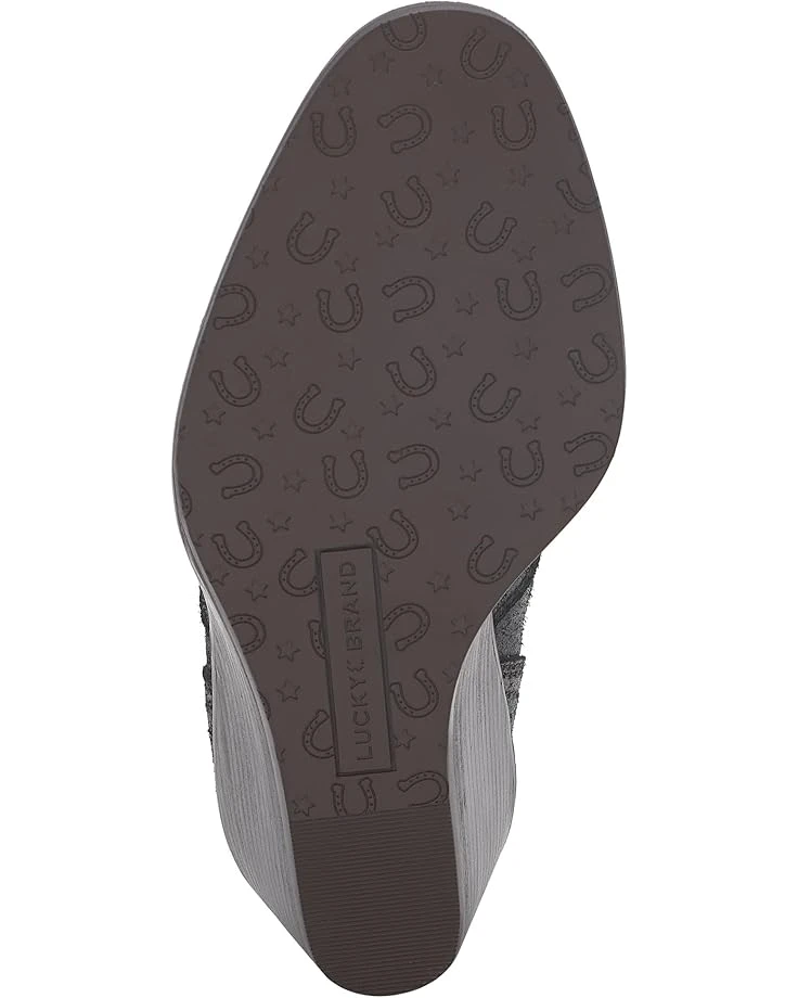 - Wedge bootie of the season! The Lucky Brand® Wilano has a burnished suede upper and exposed stack wedge heel, keeping this dressier silhouette casual and cool. The pull-on footwear features an ankle-high silhouette with pleated gore panels and heel pull tabs for easy wear.