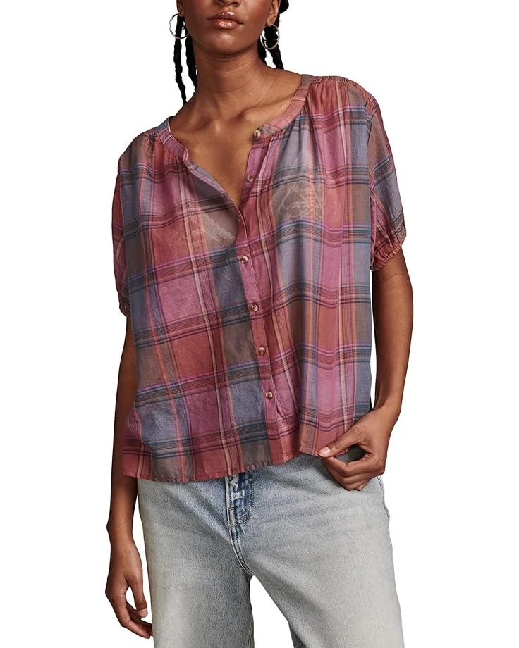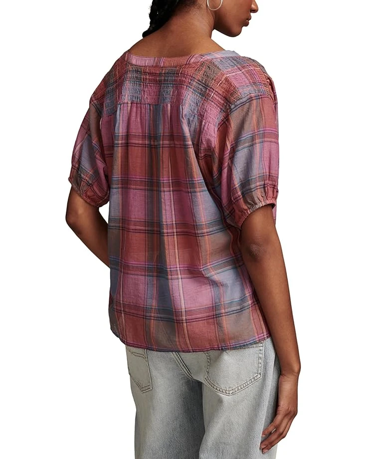 - Feel gorgeous in the classy design of the plaid Lucky Brand® Yarndyed Smocked Shoulder Blouse, featured on a yard-dyed cotton with a button-down front, short sleeves and elasticized cuffs.